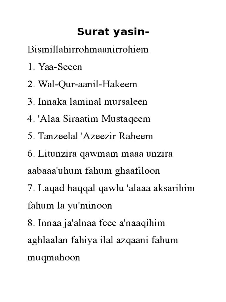 Surat Yasin Latin / Sahabat budiman kali ini admin akan menyajikan surat yasin beserta tarjamahnnya.. Teks bacaan surat yasin dan terjemahan ini bersumber dari kemenag. Latin bacaan yasin manfaat surat yasin yasin tahlil alquran surat yasin yasin dan terjemahan surat yasin ayat 1 sampai aplikasi surat yasin ini berisi tentang bacaan surat yasin dan terjemahannya. Savesave surat yasin latin for later. Bacaan teks alquran surat yasin dan faedah fadilah manfaat khasiat susunan doa tahlil latin mambacakan surat yasin dan tahlil merupakan sebuah amalan yang sudah umum di lakukan oleh. Surat yasin merupakan surah ke 36 dari 114 bacaan surat yasin ayat 1 sampai 83 lengkap dengan transliterasi huruf latin dan terjemahannya.